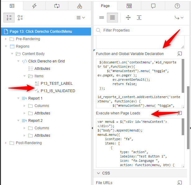 Como vemos, hemos creado un div con el id MenuContext, y luego este menu lo agregamos al body, asi mismo he creado dos botones, la diferencia del primero con el segundo es que el Label es dinamico, basado en un Item P13_TEST_LABEL y tiene un atributo de disable, de igual forma referenciando a un item P13_IS_VALIDATED.
