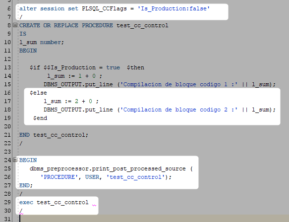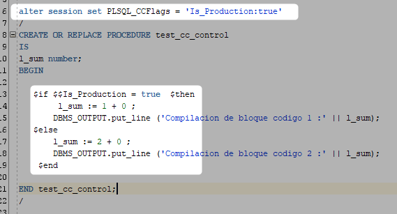 Declaramos nuestra variable (IS_PRODUCTION) con un alter y luego compilaremos el procedure usando esta variable.
