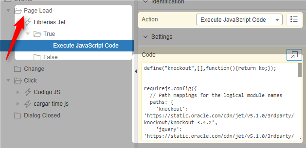 Luego creamos una acción dinamica, cuando carga la pagina para agregar las librerias de JET 5.1.