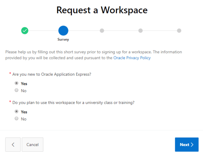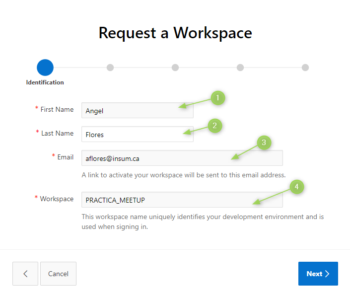 La segunda forma es socitar un espacio de trabajo en https://apex.oracle.com/