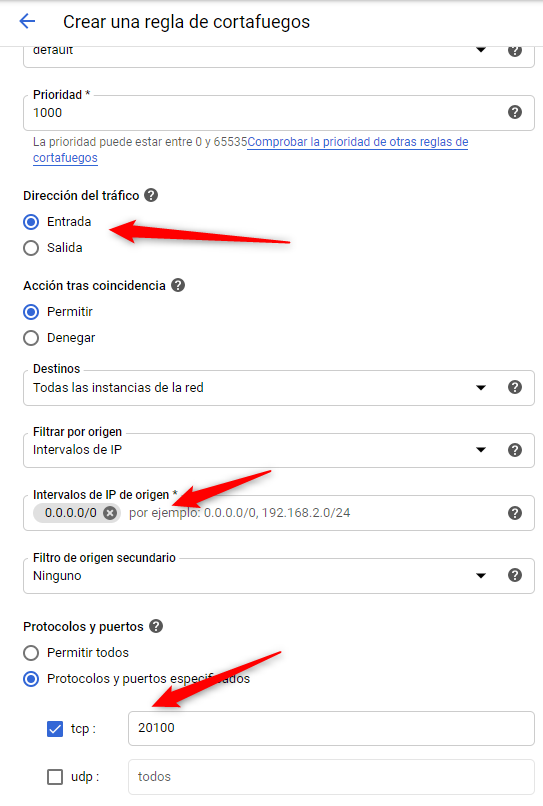 Agregaremos al puerto TCP de entrada el puerto que seleccionamos anteriormente, en mi caso 20100