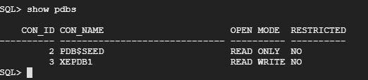 Podemos ejecutar show pdbs y ver las pdbs activas.