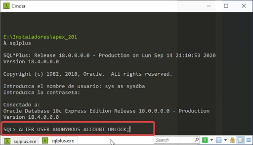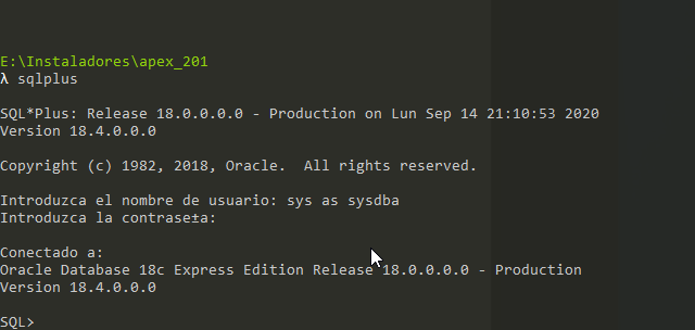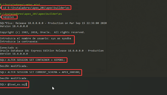 De preferencia abrimos una nueva ventana de CMD, cambiamos nuestro directorio a donde esta la carpeta builder con el lenguaje que deseamos instalar en mi ejemplo, es \”E:\\Instaladores\\apex_201\\apex\\builder\\es\” y nos conectamos como sys dba y ejecutamos: