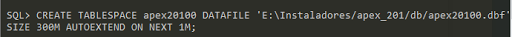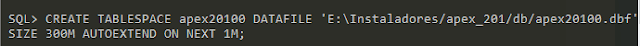 CREATE TABLESPACE apex20100 DATAFILE \’E:\\Instaladores/apex_201/db/apex20100.dbf\’ SIZE 300M AUTOEXTEND ON NEXT 1M;