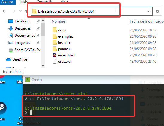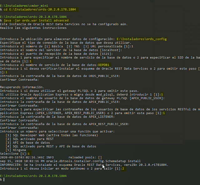 Abrimos una ventana de CMD y nos dirigimos al directorio donde hemos descomprimido ORDS en mi caso \”E:\\Instaladores\\ords-20.2.0.178.1804\”