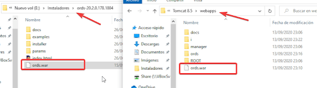 Una vez finalizada la configuración de ORDS necesitamos copiar el archivo ords.war del directorio donde ejecutamos java -jar xxxx Y lo pegamos en la carpeta web apps de Tomcat usualmente en esta dirección \”C:\\Program Files\\Apache Software Foundation\\Tomcat 8.5\\webapps\”