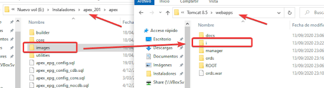 Ahora necesitamos las imagenes, para ello copiamos del directorio de APEX , la carpeta imágenes y la pegamos en webapps de tomcat, asi mismo renombramos la carpeta a solo \”i\”