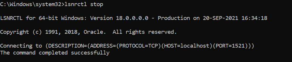 Abre una ventana de CMD en modo administrador y ejecuta lsnrctl stop
