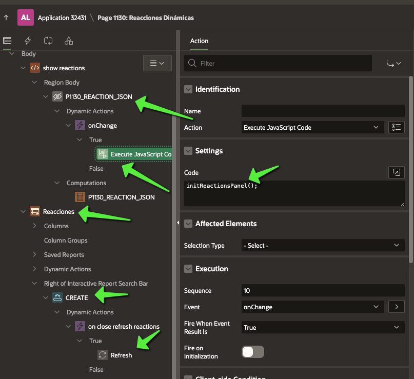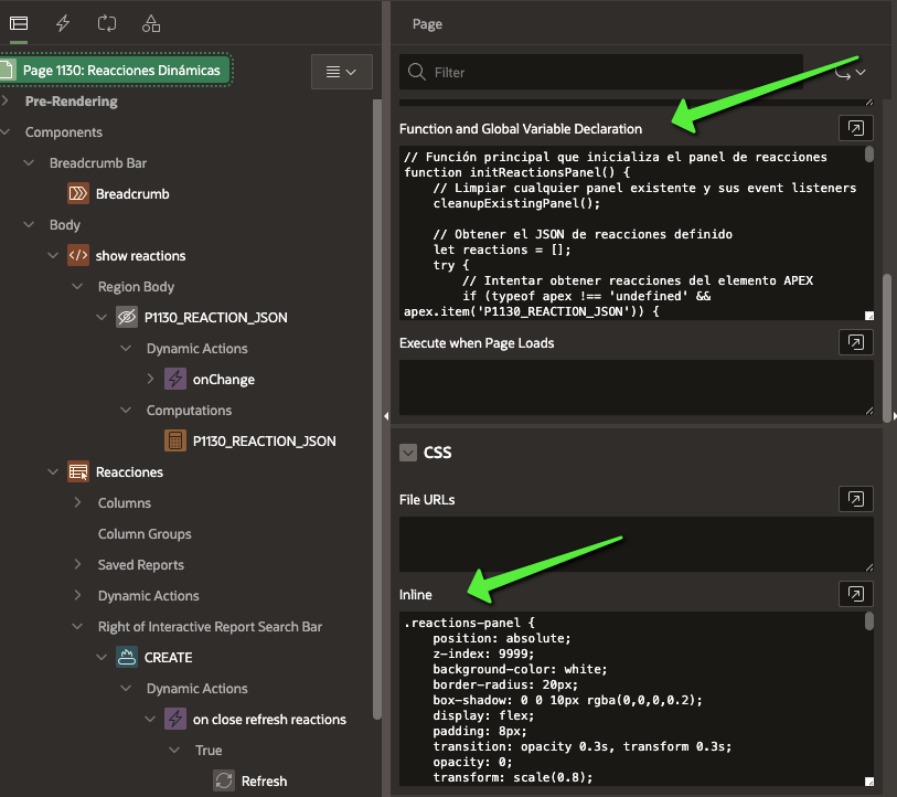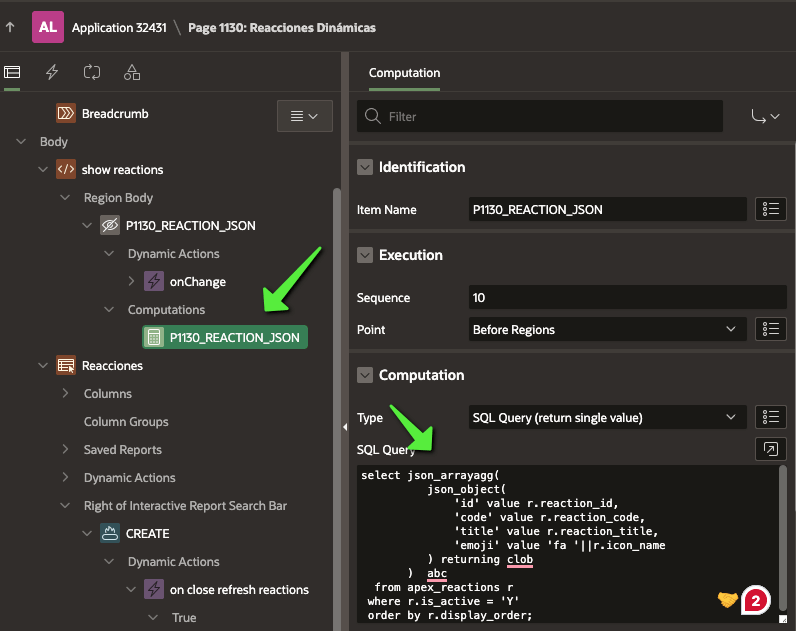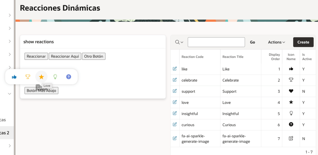 Actualmente, tengo una región donde se gestionan las reacciones: aquí puedes desactivar, crear o eliminar reacciones. Luego, existe un proceso PL/SQL similar al anterior que guarda el resultado en la variable P1130_REACTION_JSON. Cuando este ítem cambia, se dispara una función JavaScript que actualiza el menú con las nuevas reacciones disponibles.