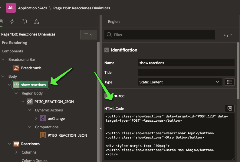 Una vez creada la tabla y cargados los datos, vamos a crear dos regiones en APEX: una para mostrar nuestros botones. Estos botones tendrán una clase CSS específica, que será clave, ya que todo elemento que use esta clase podrá manejar sus propias reacciones de forma independiente.